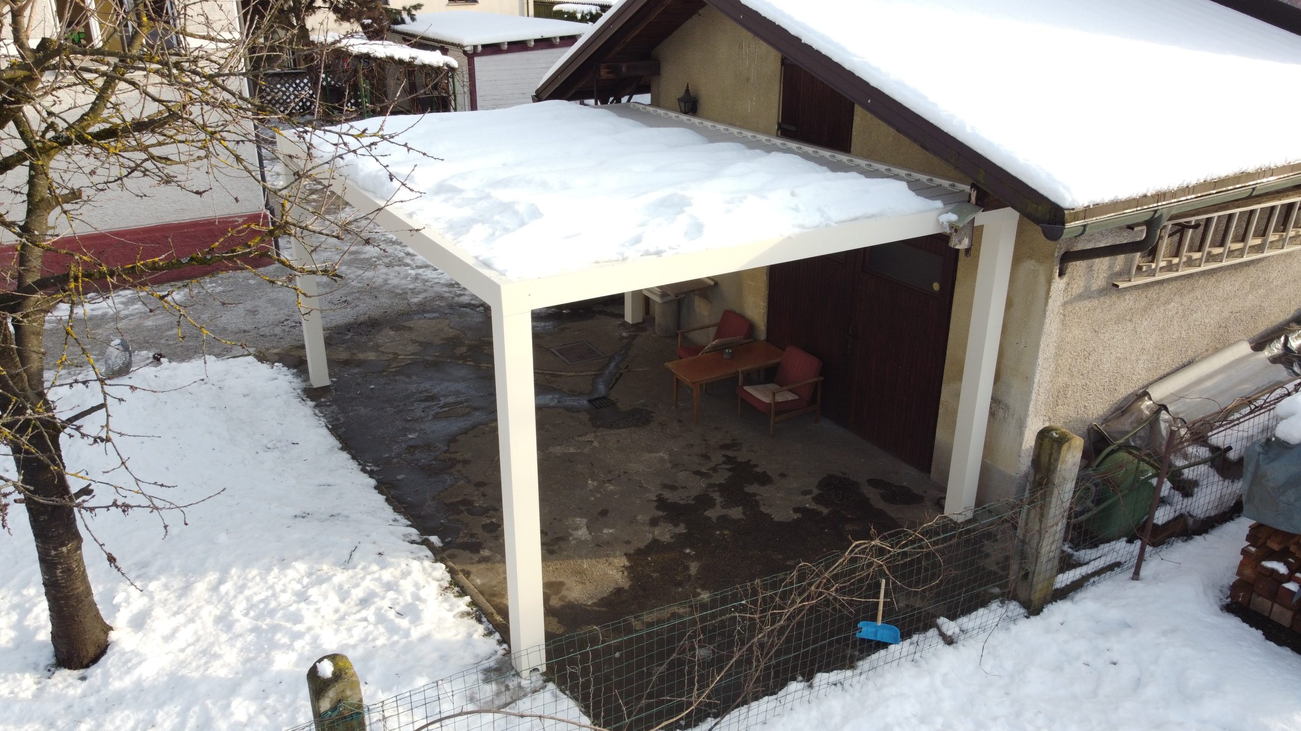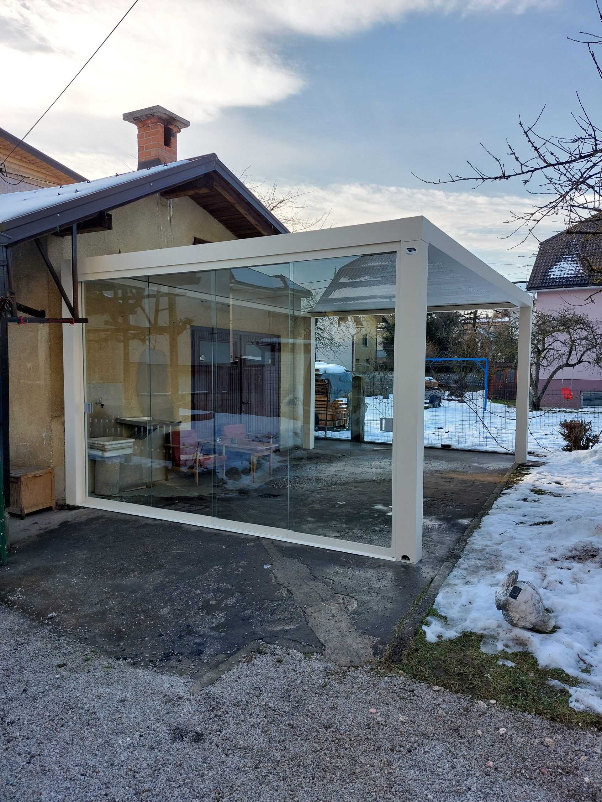 Bioklimatska pergola z zložljivimi lamelami in dodatno stransko zasteklitvijo postavljeno v Ljubljani leta 2024.