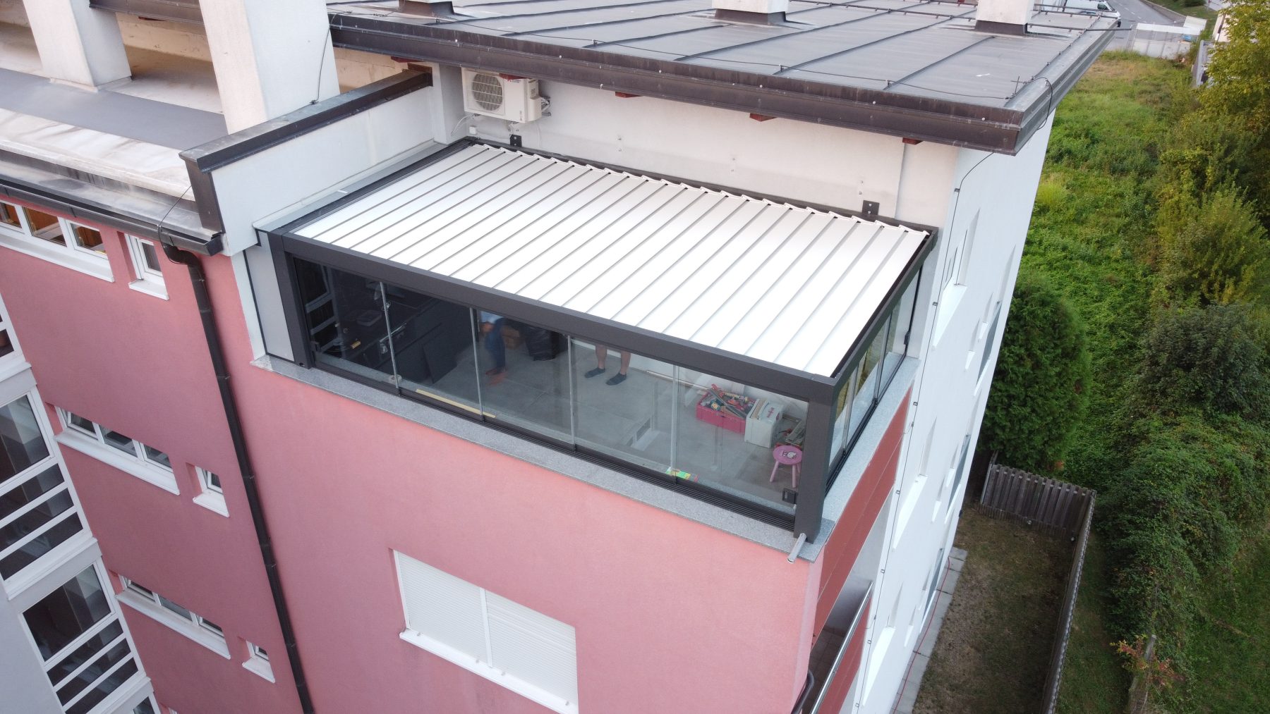 Bioklimatska pergola z zložljivimi lamelami in stransko zapiranje z drsnimi stekli, montaža v Mariboru